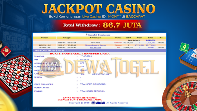 DEWATOGEL mengucapkan selamat kepada user id : MON*** yang telah berhasil mendapatkan jackpot pada permainan LIVE CASINO BACCARAT. Kemenangan sebesar Rp 86.700.000,-. telah dibayarkan LUNAS oleh pihak dewatogel kepada pemilik user id setelah yang bersangkutan mengisi formulir withdraw. Proses pencairan dana berlangsung sangat cepat hanya dalam waktu 5-10 menit sudah berada dalam rekening pemilik user id. Bukti transfer yang dapat anda lihat adalah bukti SAH / VALID yang langsung di dapatkan melalui bukti transaksi dari Bank yang digunakan untuk pengiriman dana pada rekening pemilik user id. Terima kasih kami sampaikan kepada para pengguna setia DEWATOGEL yang telah menggunakan situs kami, sebagai Bandar Terpercaya yang pastinya membayar semua kemenangan member hingga lunas. Apakah DEWATOGEL PENIPU ? Reputasi “DEWATOGEL TERPERCAYA” sudah sangat melekat. puluhan hingga ratusan ribu pengguna setia DEWATOGEL tetap menggunakan situs terbesar dan terbaik di Indonesia ini. Hapus rasa was-was dan khawatir anda, kemenangan anda berapapun PASTI dibayarkan hingga lunas.